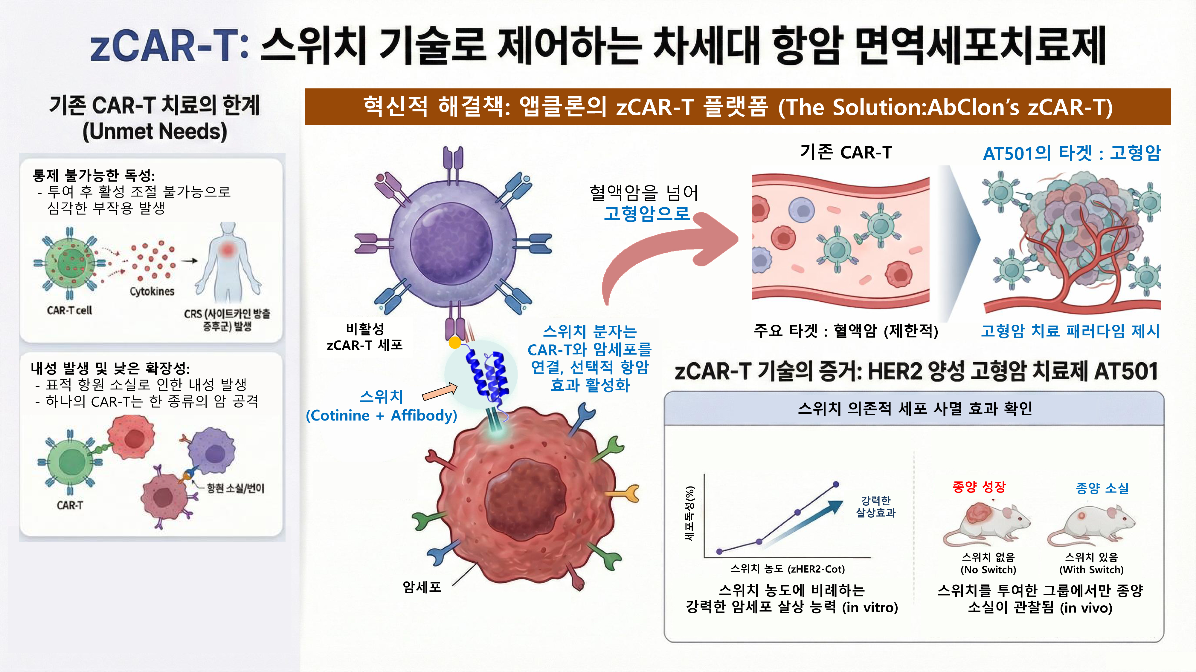 AT501은 zCAR-T 기술이 적용된 CAR-T 활성조절이 가능한 치료제로서 질환 단백질 HER2를 표적하는 면역항암제입니다.